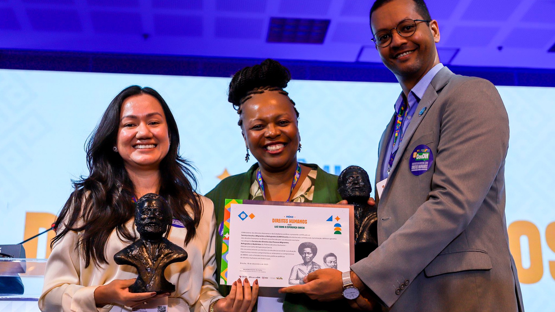 O Serviço Jesuíta a Migrantes e Refugiados (SJMR) recebeu, na quarta-feira (10), o Prêmio Direitos Humanos – Edição Luiz Gama & Esperança Garcia, concedido pelo Ministério dos Direitos Humanos e da Cidadania (MDHC), na categoria Garantia dos Direitos das Pessoas Migrantes, Refugiadas e Apátridas. A entrega ocorreu durante a 13ª Conferência Nacional de Direitos Humanos (ConDH), em Brasília (DF).